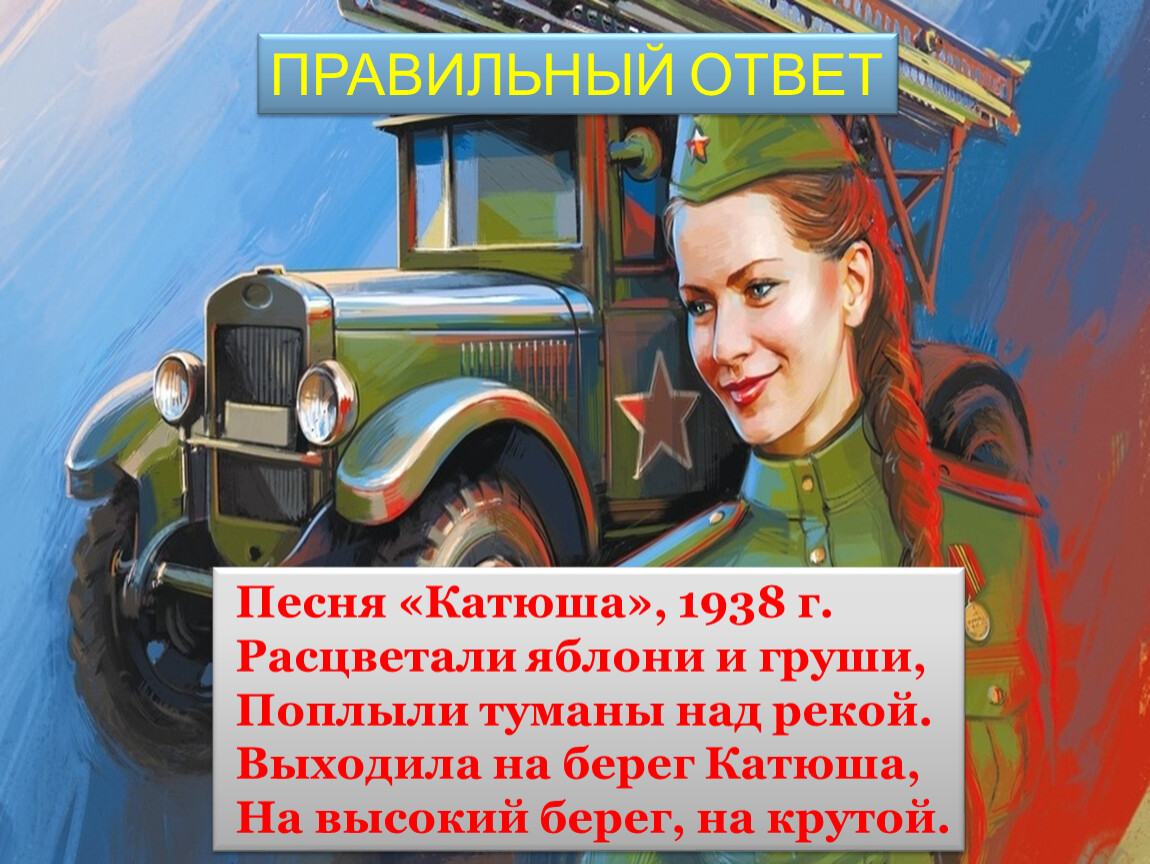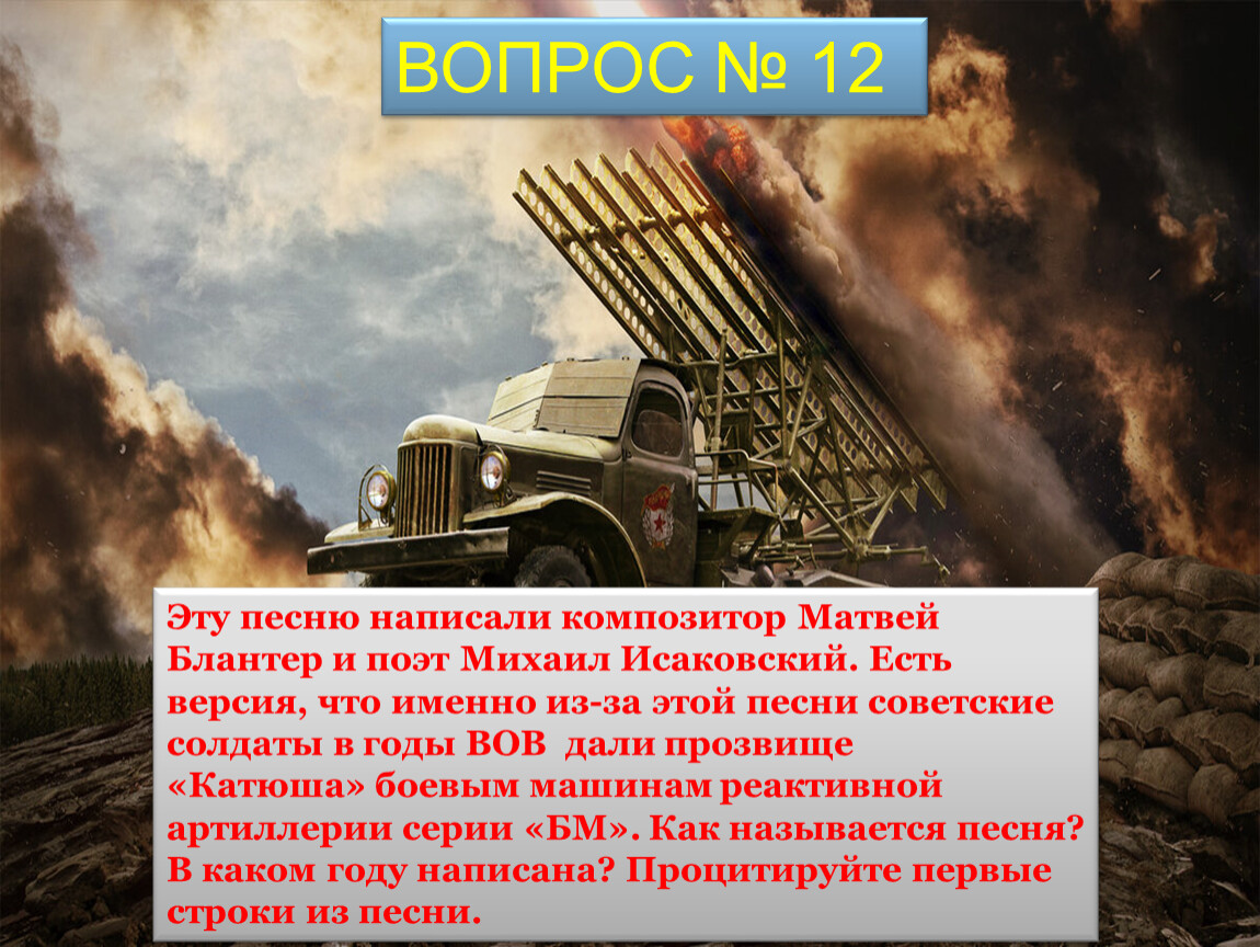 Эту песню написали композитор Матвей Блантер и поэт Михаил Исаковский. Есть версия, что именно из-за этой песни советские солдаты в годы ВОВ дали прозвище «Катюша» боевым машинам реактивной артиллерии серии «БМ». Как называется песня? В каком году написана? Процитируйте первые строки из песни.