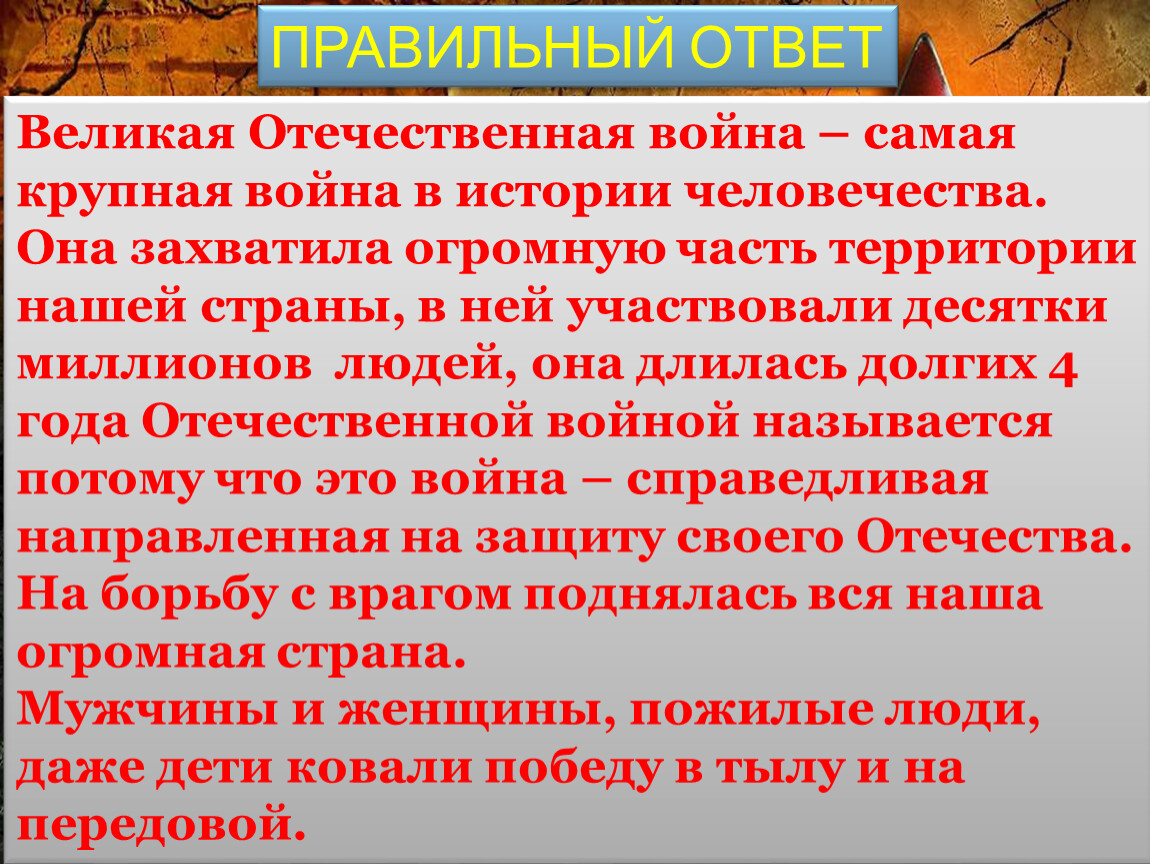 нашей страны, в ней участвовали десятки миллионов людей, она длилась долгих 4 года Отечественной войной называется потому что это война – справедливая направленная на защиту своего Отечества. На борьбу с врагом поднялась вся наша огромная страна.