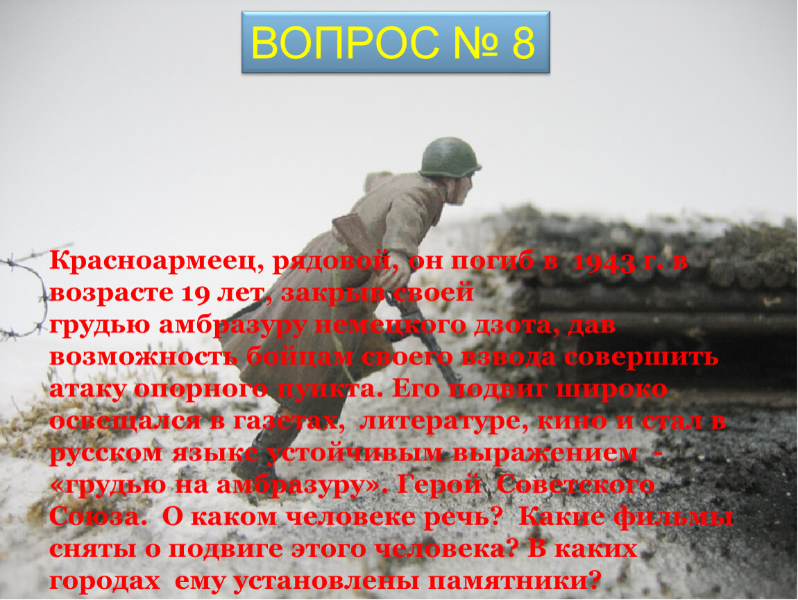 Красноармеец, рядовой, он погиб в 1943 г. в возрасте 19 лет, закрыв своей грудью амбразуру немецкого дзота, дав возможность бойцам своего взвода совершить атаку опорного пункта. Его подвиг широко освещался в газетах, литературе, кино и стал в русском языке устойчивым выражением - «грудью на амбразуру». Герой Советского Союза. О каком человеке речь? Какие фильмы сняты о подвиге этого человека? В каких городах ему установлены памятники?