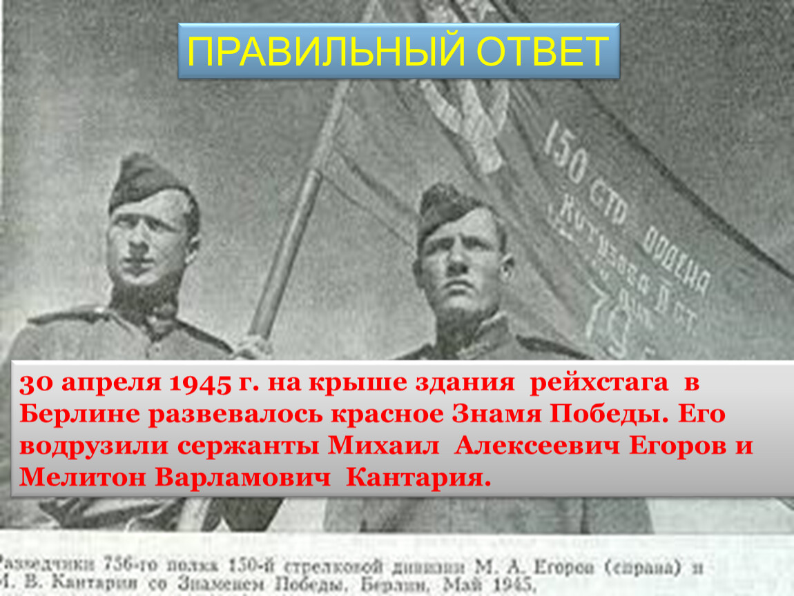 30 апреля 1945 г. на крыше здания рейхстага в Берлине развевалось красное Знамя Победы. Его водрузили сержанты Михаил Алексеевич Егоров и Мелитон Варламович Кантария.
