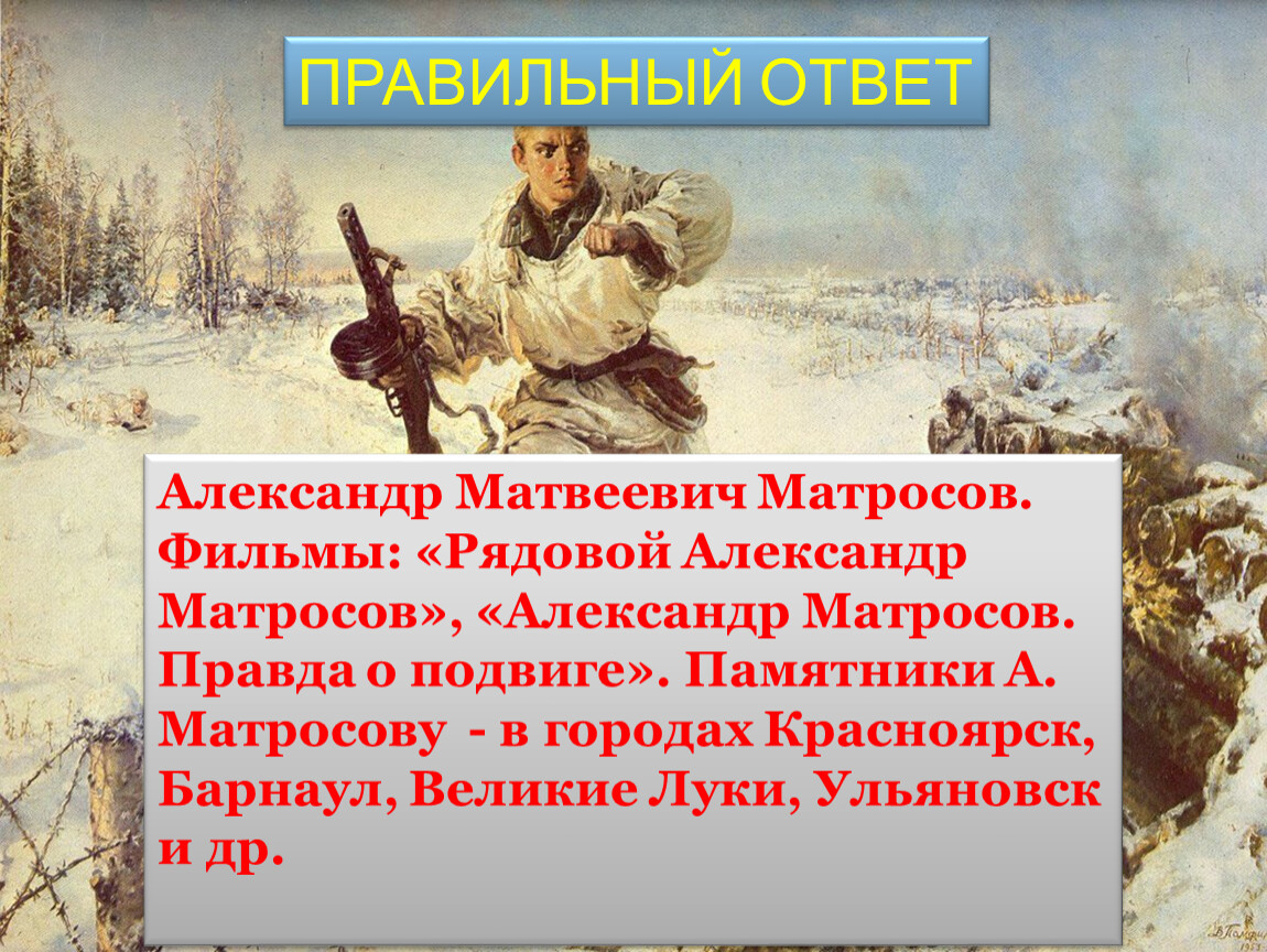 Александр Матвеевич Матросов. Фильмы: «Рядовой Александр Матросов», «Александр Матросов. Правда о подвиге». Памятники А. Матросову - в городах Красноярск, Барнаул, Великие Луки, Ульяновск и др.