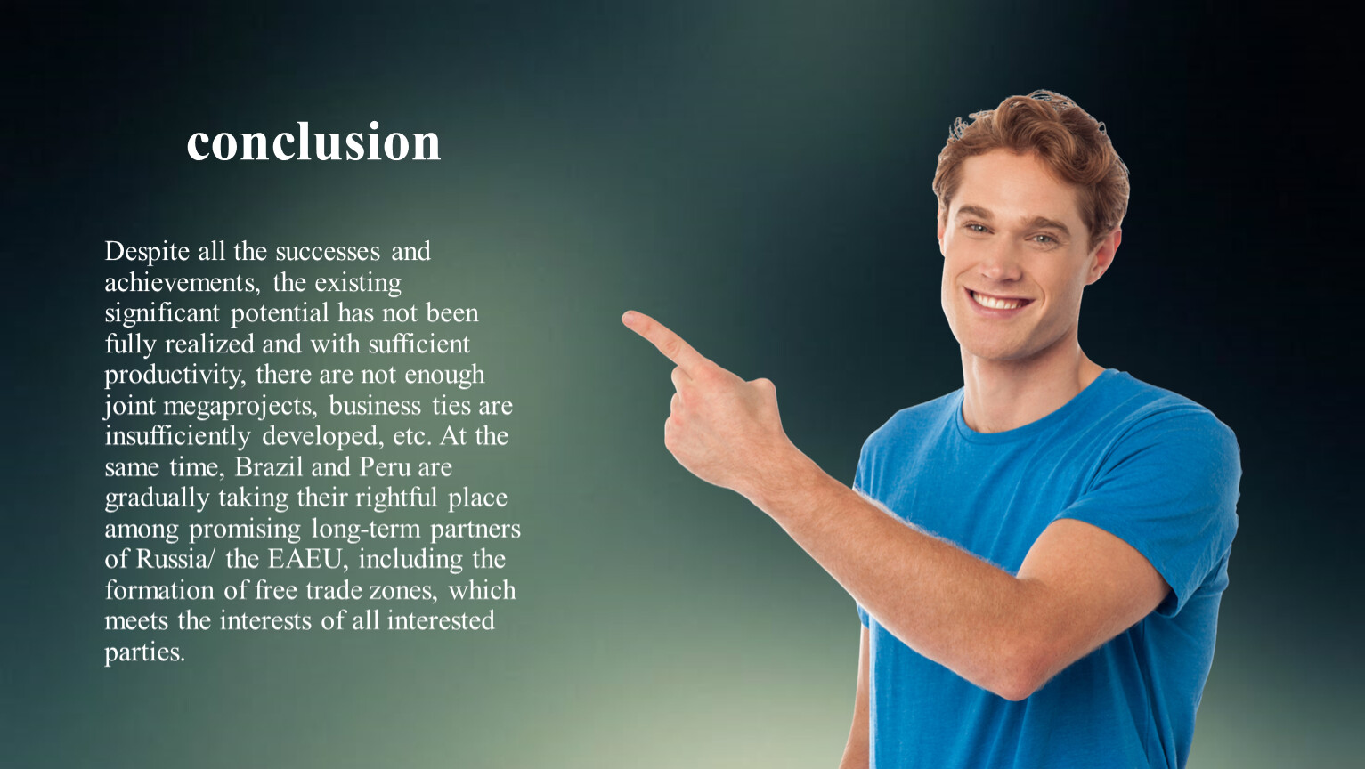 Despite all the successes and achievements, the existing significant potential has not been fully realized and with sufficient productivity, there are not enough joint megaprojects, business ties are insufficiently developed, etc. At the same time, Brazil and Peru are gradually taking their rightful place among promising long-term partners of Russia/ the EAEU, including the formation of free trade zones, which meets the interests of all interested parties.