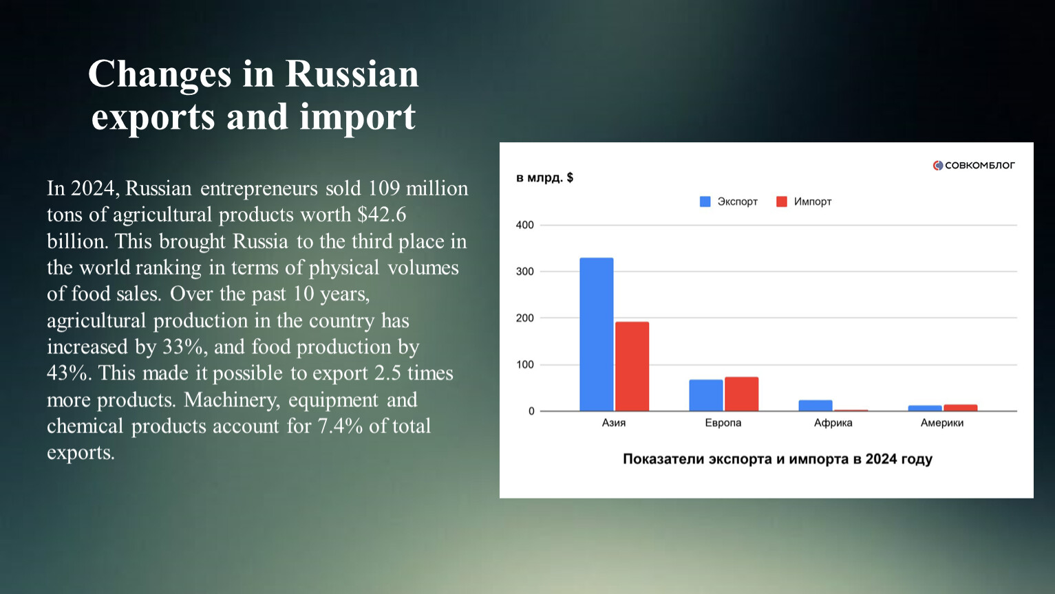 In 2024, Russian entrepreneurs sold 109 million tons of agricultural products worth $42.6 billion. This brought Russia to the third place in the world ranking in terms of physical volumes of food sales. Over the past 10 years, agricultural production in the country has increased by 33%, and food production by 43%. This made it possible to export 2.5 times more products. Machinery, equipment and chemical products account for 7.4% of total exports.