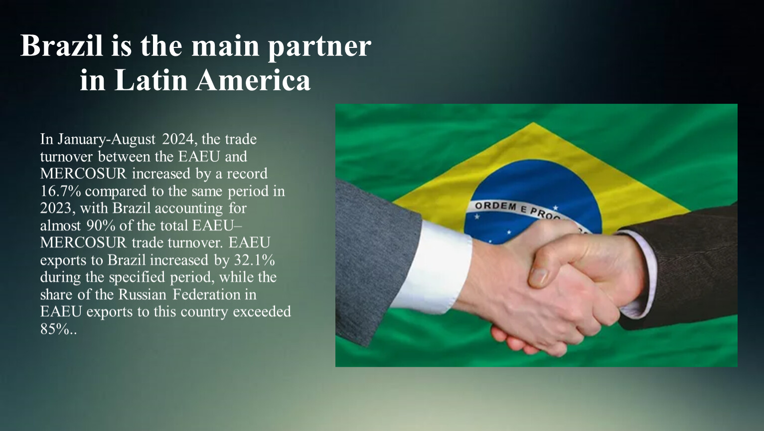 In January-August 2024, the trade turnover between the EAEU and MERCOSUR increased by a record 16.7% compared to the same period in 2023, with Brazil accounting for almost 90% of the total EAEU–MERCOSUR trade turnover. EAEU exports to Brazil increased by 32.1% during the specified period, while the share of the Russian Federation in EAEU exports to this country exceeded 85%..
