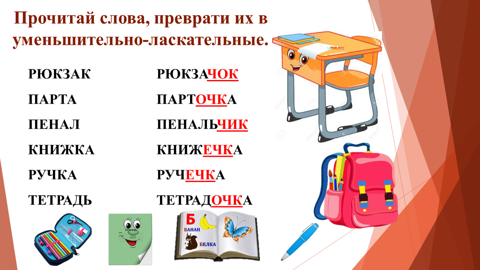 Прочитай слова, преврати их в уменьшительно-ласкательные.