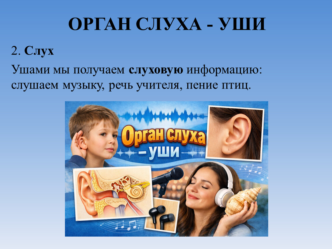 Ушами мы получаем слуховую информацию: слушаем музыку, речь учителя, пение птиц.