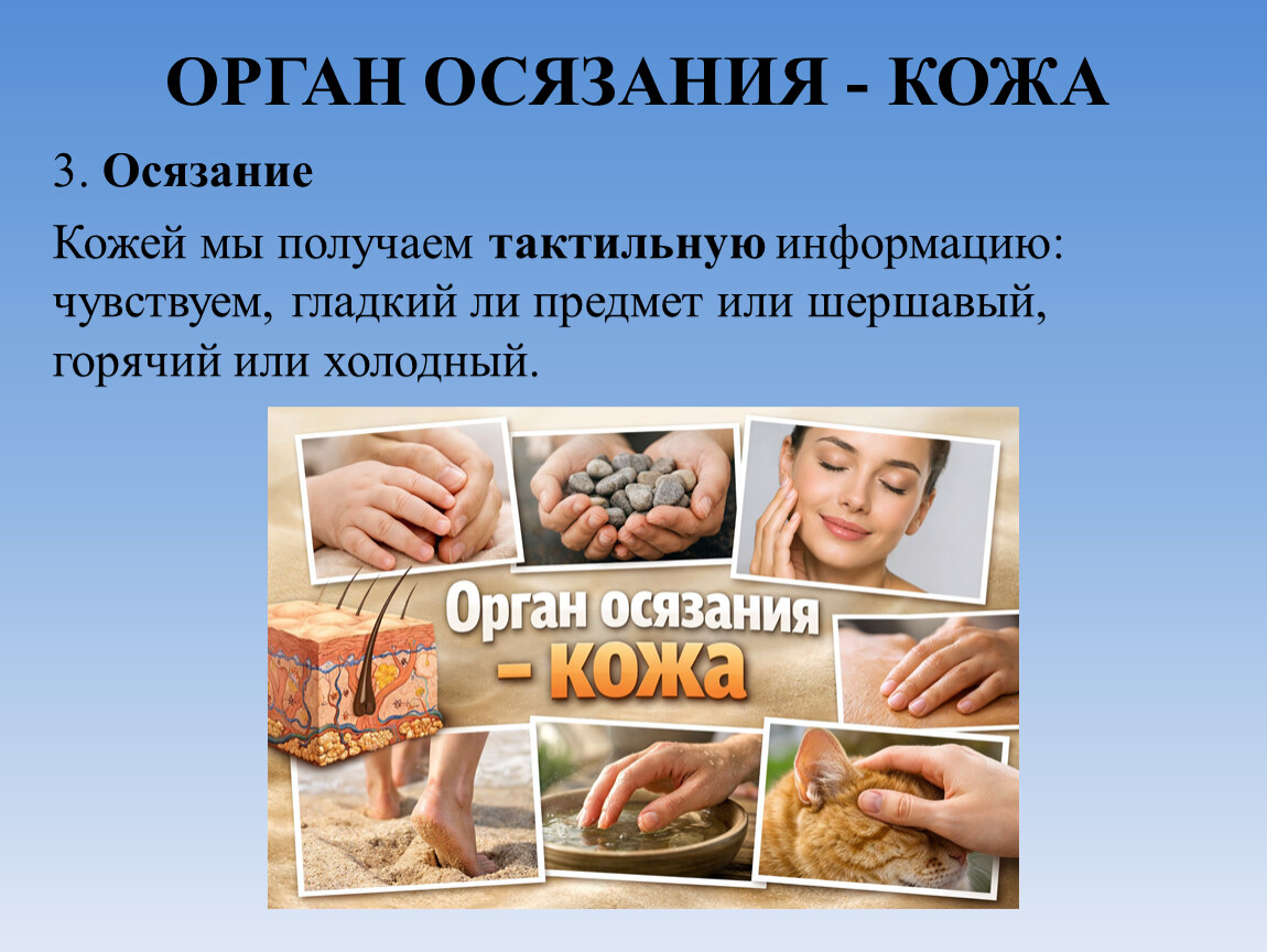 Кожей мы получаем тактильную информацию: чувствуем, гладкий ли предмет или шершавый, горячий или холодный.