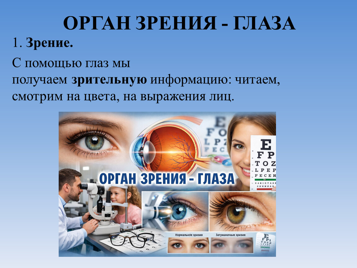 С помощью глаз мы получаем зрительную информацию: читаем, смотрим на цвета, на выражения лиц.