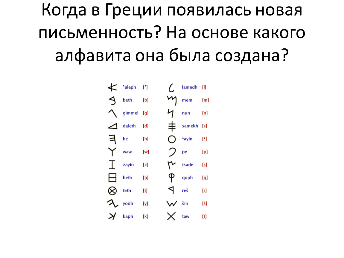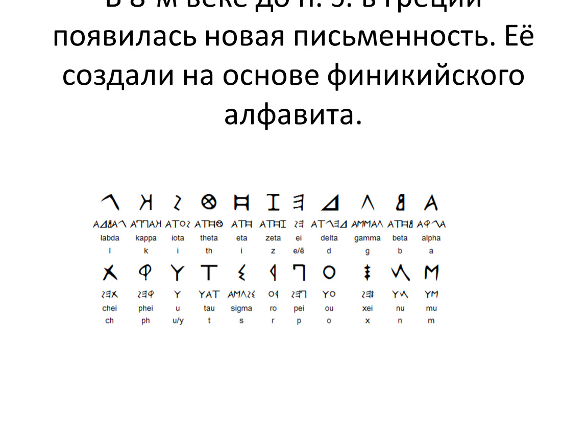 В 8-м веке до н. э. в Греции появилась новая письменность. Её создали на основе финикийского алфавита.