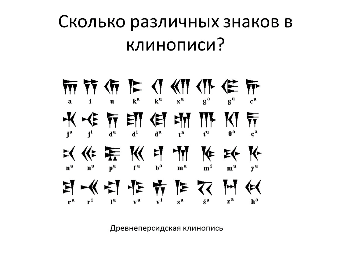 Состав клинописи насчитывает 300 - 900 знаков для слоговой и идеографической систем общения; порядка 30 букв для фонетической адаптации на восточном побережье Средиземного моря; 36 букв для старо-персидского слогового алфавита.