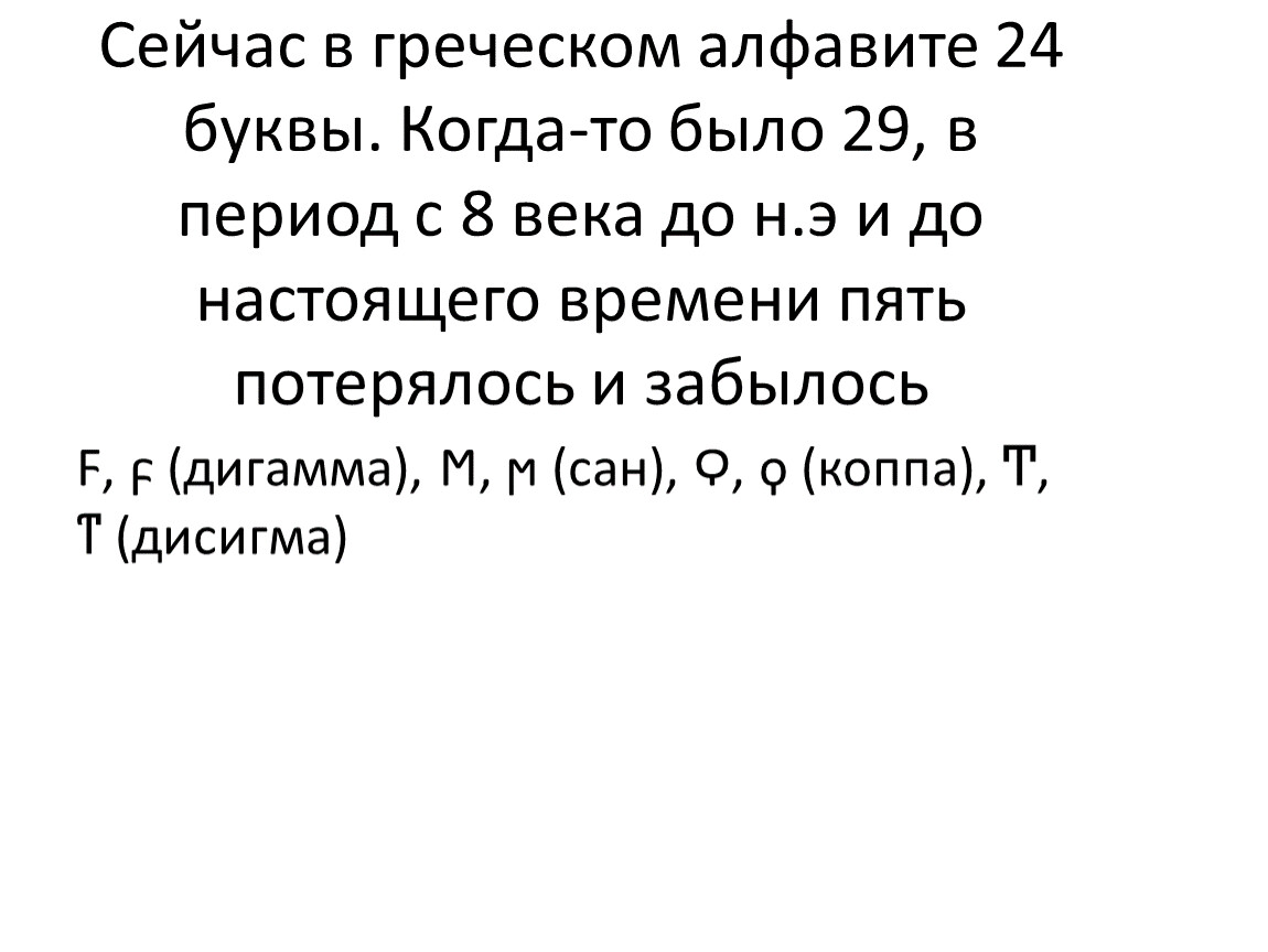 Сейчас в греческом алфавите 24 буквы. Когда-то было 29, в период с 8 века до н.э и до настоящего времени пять потерялось и забылось