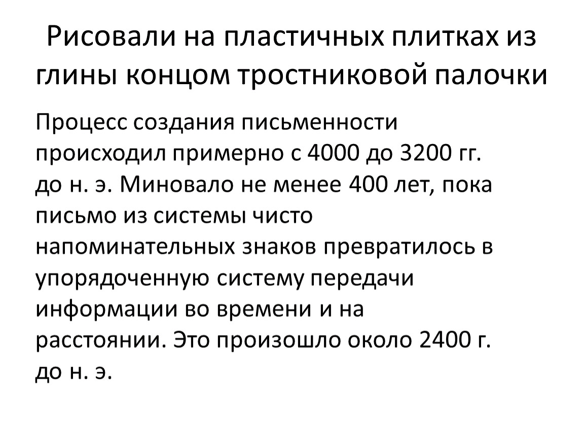 Процесс создания письменности происходил примерно с 4000 до 3200 гг. до н. э. Миновало не менее 400 лет, пока письмо из системы чисто напоминательных знаков превратилось в упорядоченную систему передачи информации во времени и на расстоянии. Это произошло около 2400 г. до н. э.