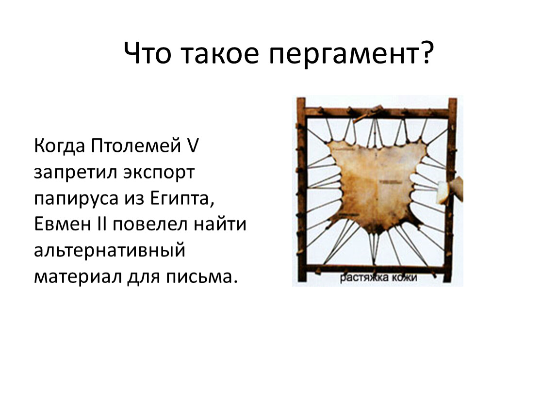 Когда Птолемей V запретил экспорт папируса из Египта, Евмен II повелел найти альтернативный материал для письма.