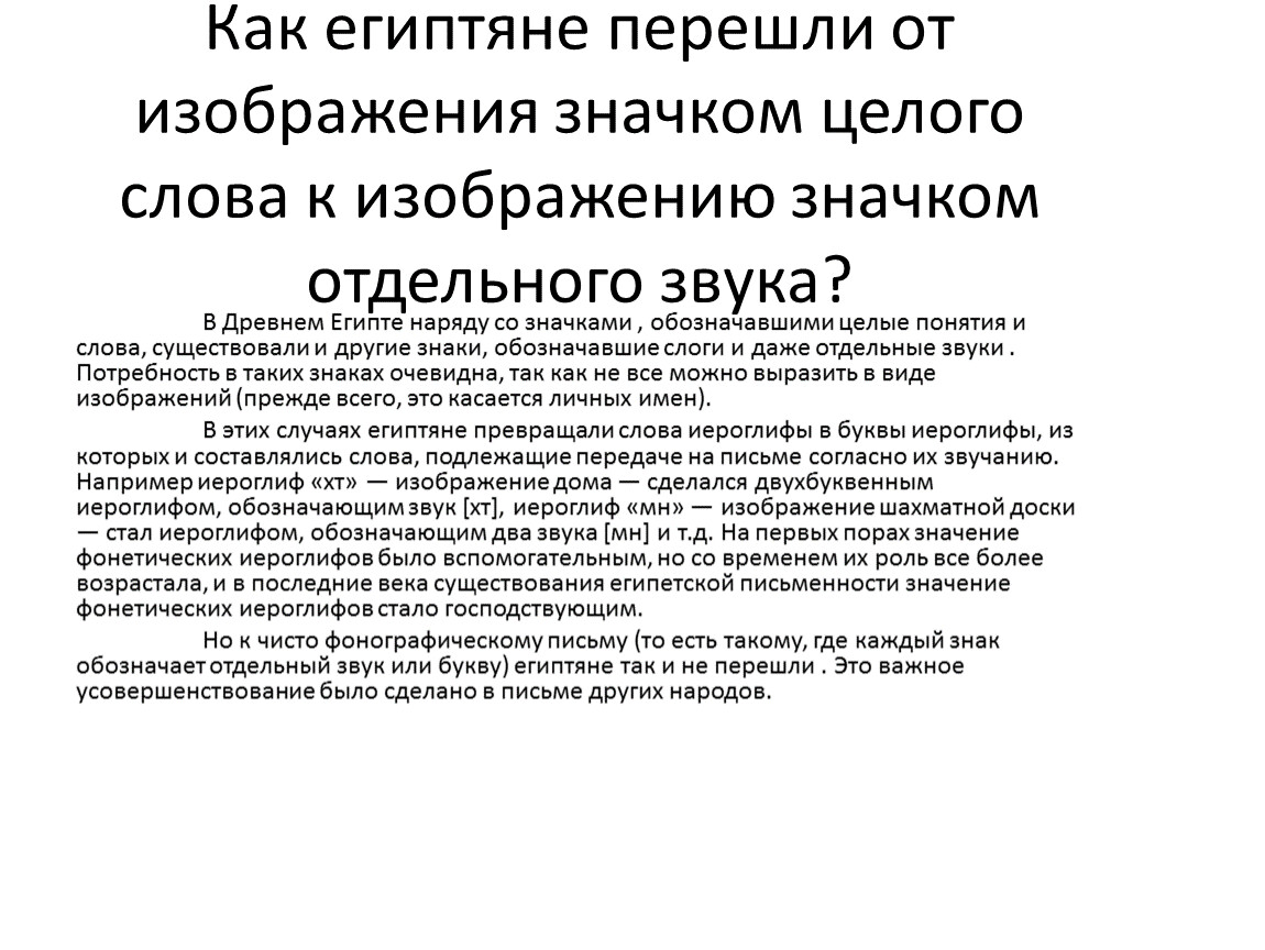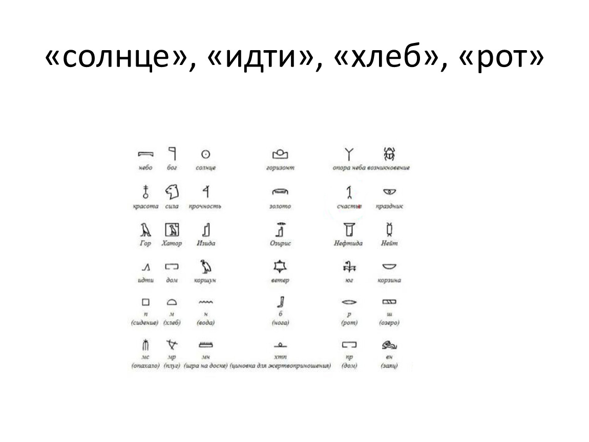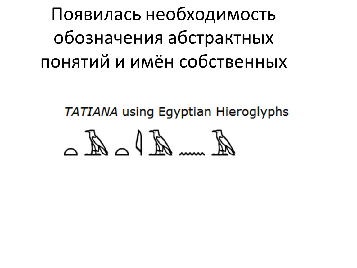 В Древнем Египте наряду со значками , обозначавшими целые понятия и слова, существовали и другие знаки, обозначавшие слоги и даже отдельные звуки . Потребность в таких знаках очевидна, так как не все можно выразить в виде изображений (прежде всего, это касается личных имен).
