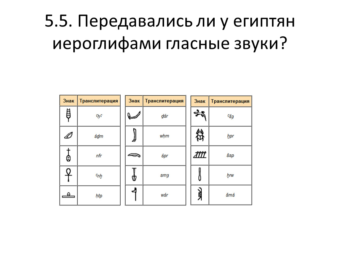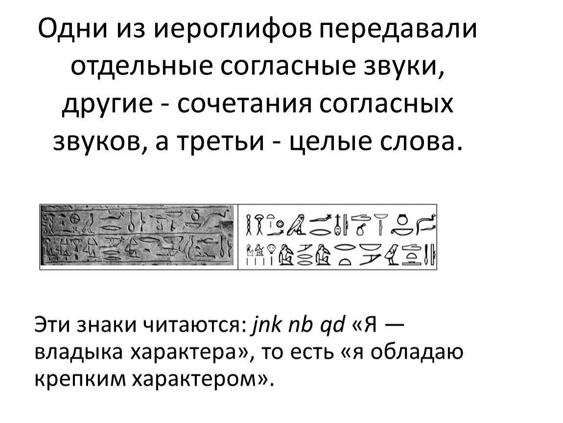 Одни из иероглифов передавали отдельные согласные звуки, другие - сочетания согласных звуков, а третьи - целые слова.