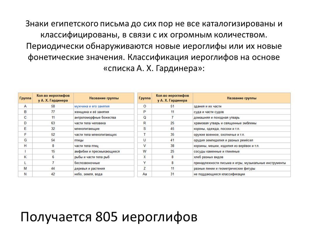 Знаки египетского письма до сих пор не все каталогизированы и классифицированы, в связи с их огромным количеством. Периодически обнаруживаются новые иероглифы или их новые фонетические значения. Классификация иероглифов на основе «списка А. Х. Гардинера»: