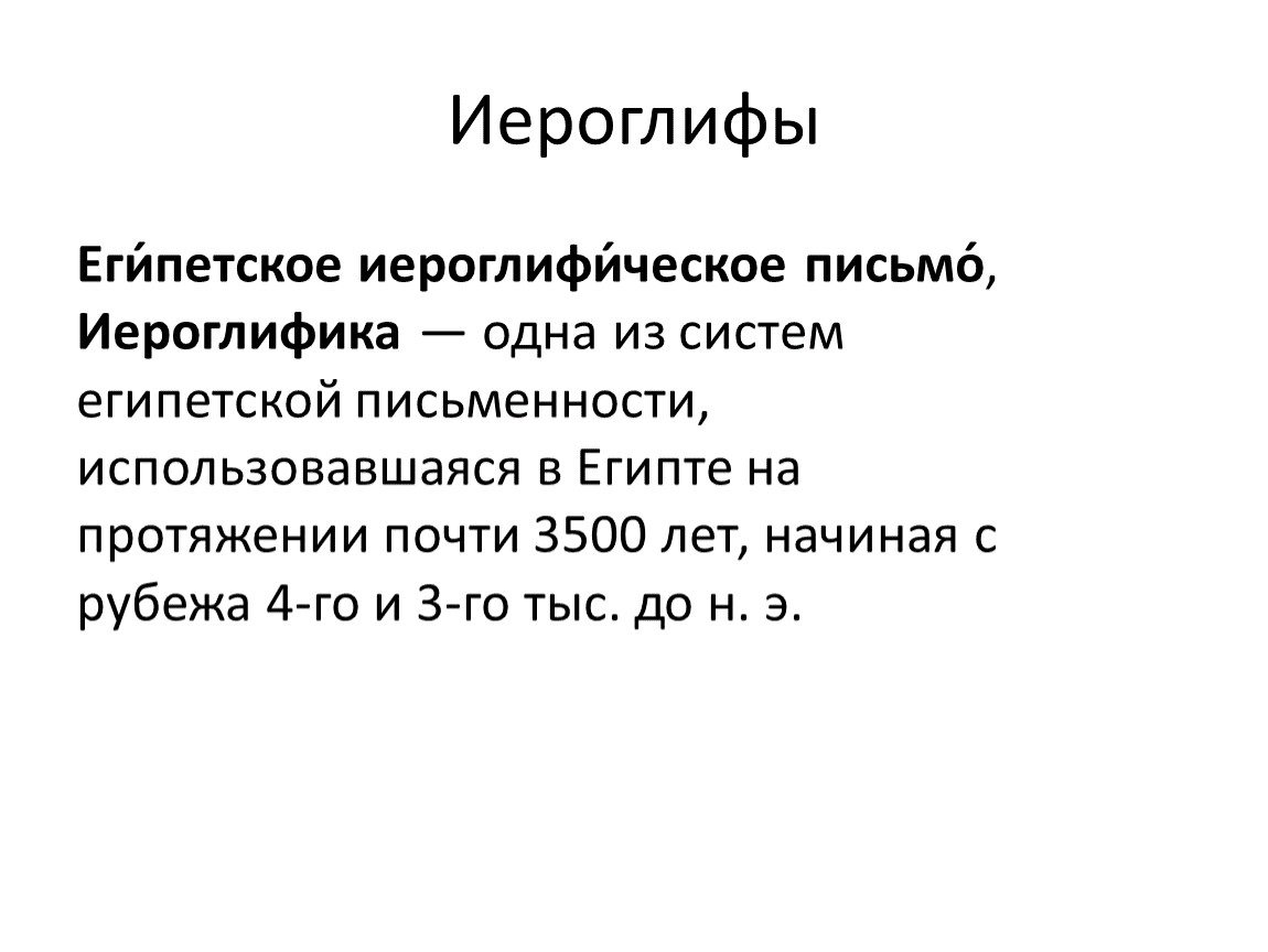 Еги́петское иероглифи́ческое письмо́, Иероглифика — одна из систем египетской письменности, использовавшаяся в Египте на протяжении почти 3500 лет, начиная с рубежа 4-го и 3-го тыс. до н. э.