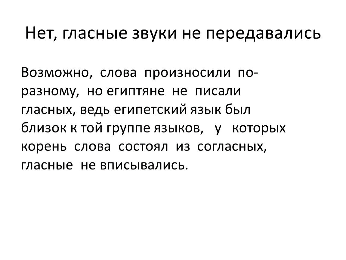 Возможно, слова произносили по-разному, но египтяне не писали гласных, ведь египетский язык был близок к той группе языков, у которых корень слова состоял из согласных, гласные не вписывались.
