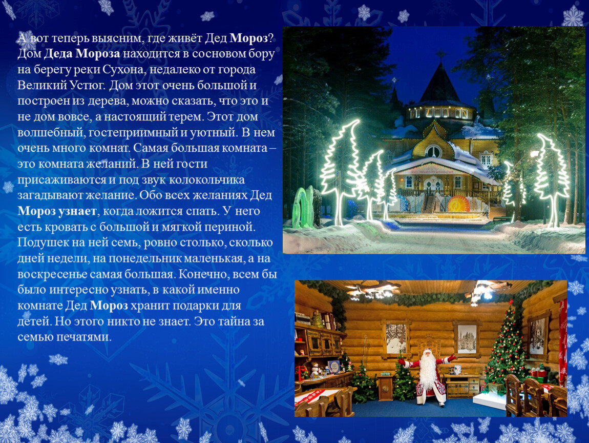 Дом Деда Мороза находится в сосновом бору на берегу реки Сухона, недалеко от города Великий Устюг. Дом этот очень большой и построен из дерева, можно сказать, что это и не дом вовсе, а настоящий терем. Этот дом волшебный, гостеприимный и уютный. В нем очень много комнат. Самая большая комната – это комната желаний. В ней гости присаживаются и под звук колокольчика загадывают желание. Обо всех желаниях Дед Мороз узнает, когда ложится спать. У него есть кровать с большой и мягкой периной. Подушек на ней семь, ровно столько, сколько дней недели, на понедельник маленькая, а на воскресенье самая большая. Конечно, всем бы было интересно узнать, в какой именно комнате Дед Мороз хранит подарки для детей. Но этого никто не знает. Это тайна за семью печатями.