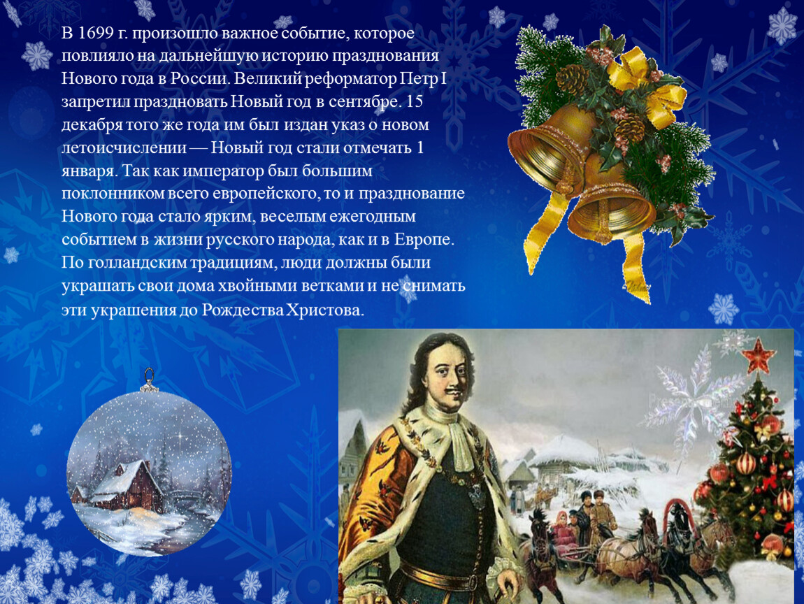 В 1699 г. произошло важное событие, которое повлияло на дальнейшую историю празднования Нового года в России. Великий реформатор Петр I запретил праздновать Новый год в сентябре. 15 декабря того же года им был издан указ о новом летоисчислении — Новый год стали отмечать 1 января. Так как император был большим поклонником всего европейского, то и празднование Нового года стало ярким, веселым ежегодным событием в жизни русского народа, как и в Европе. По голландским традициям, люди должны были украшать свои дома хвойными ветками и не снимать эти украшения до Рождества Христова.