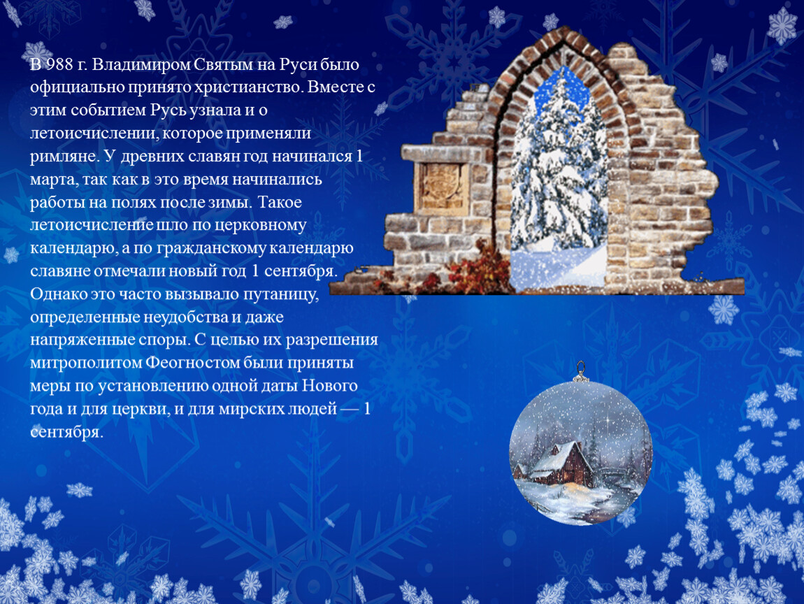 В 988 г. Владимиром Святым на Руси было официально принято христианство. Вместе с этим событием Русь узнала и о летоисчислении, которое применяли римляне. У древних славян год начинался 1 марта, так как в это время начинались работы на полях после зимы. Такое летоисчисление шло по церковному календарю, а по гражданскому календарю славяне отмечали новый год 1 сентября. Однако это часто вызывало путаницу, определенные неудобства и даже напряженные споры. С целью их разрешения митрополитом Феогностом были приняты меры по установлению одной даты Нового года и для церкви, и для мирских людей — 1 сентября.