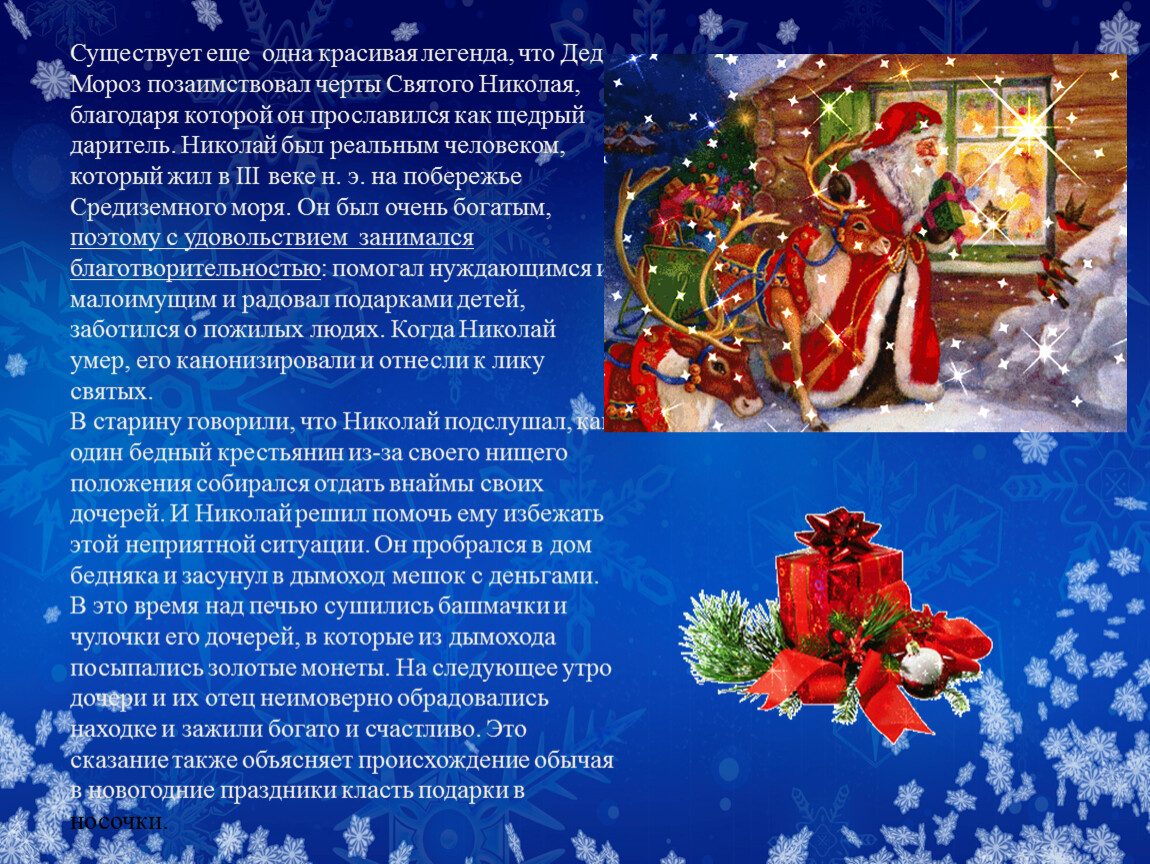 В старину говорили, что Николай подслушал, как один бедный крестьянин из-за своего нищего положения собирался отдать внаймы своих дочерей. И Николай решил помочь ему избежать этой неприятной ситуации. Он пробрался в дом бедняка и засунул в дымоход мешок с деньгами. В это время над печью сушились башмачки и чулочки его дочерей, в которые из дымохода посыпались золотые монеты. На следующее утро дочери и их отец неимоверно обрадовались находке и зажили богато и счастливо. Это сказание также объясняет происхождение обычая в новогодние праздники класть подарки в носочки.