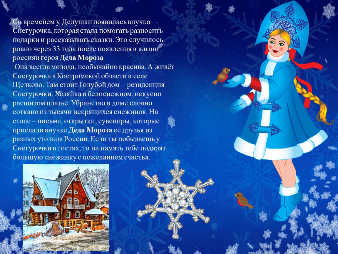 Она всегда молода, необычайно красива. А живёт Снегурочка в Костромской области в селе Щелково. Там стоит Голубой дом – резиденция Снегурочки. Хозяйка в белоснежном, искусно расшитом платье. Убранство в доме словно соткано из тысячи искрящихся снежинок. На столе – письма, открытки, сувениры, которые прислали внучке Деда Мороза её друзья из разных уголков России. Если ты побываешь у Снегурочки в гостях, то на память тебе подарят большую снежинку с пожеланием счастья.