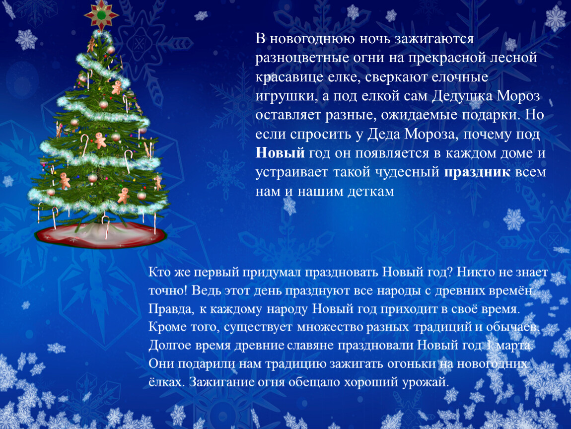 В новогоднюю ночь зажигаются разноцветные огни на прекрасной лесной красавице елке, сверкают елочные игрушки, а под елкой сам Дедушка Мороз оставляет разные, ожидаемые подарки. Но если спросить у Деда Мороза, почему под Новый год он появляется в каждом доме и устраивает такой чудесный праздник всем нам и нашим деткам
