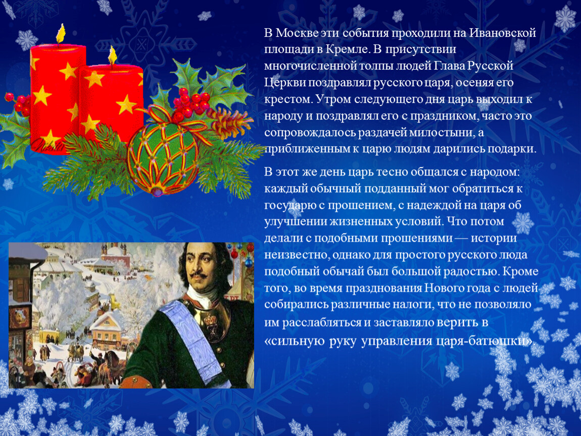В этот же день царь тесно общался с народом: каждый обычный подданный мог обратиться к государю с прошением, с надеждой на царя об улучшении жизненных условий. Что потом делали с подобными прошениями — истории неизвестно, однако для простого русского люда подобный обычай был большой радостью. Кроме того, во время празднования Нового года с людей собирались различные налоги, что не позволяло им расслабляться и заставляло верить в «сильную руку управления царя-батюшки».