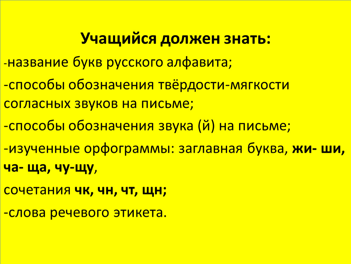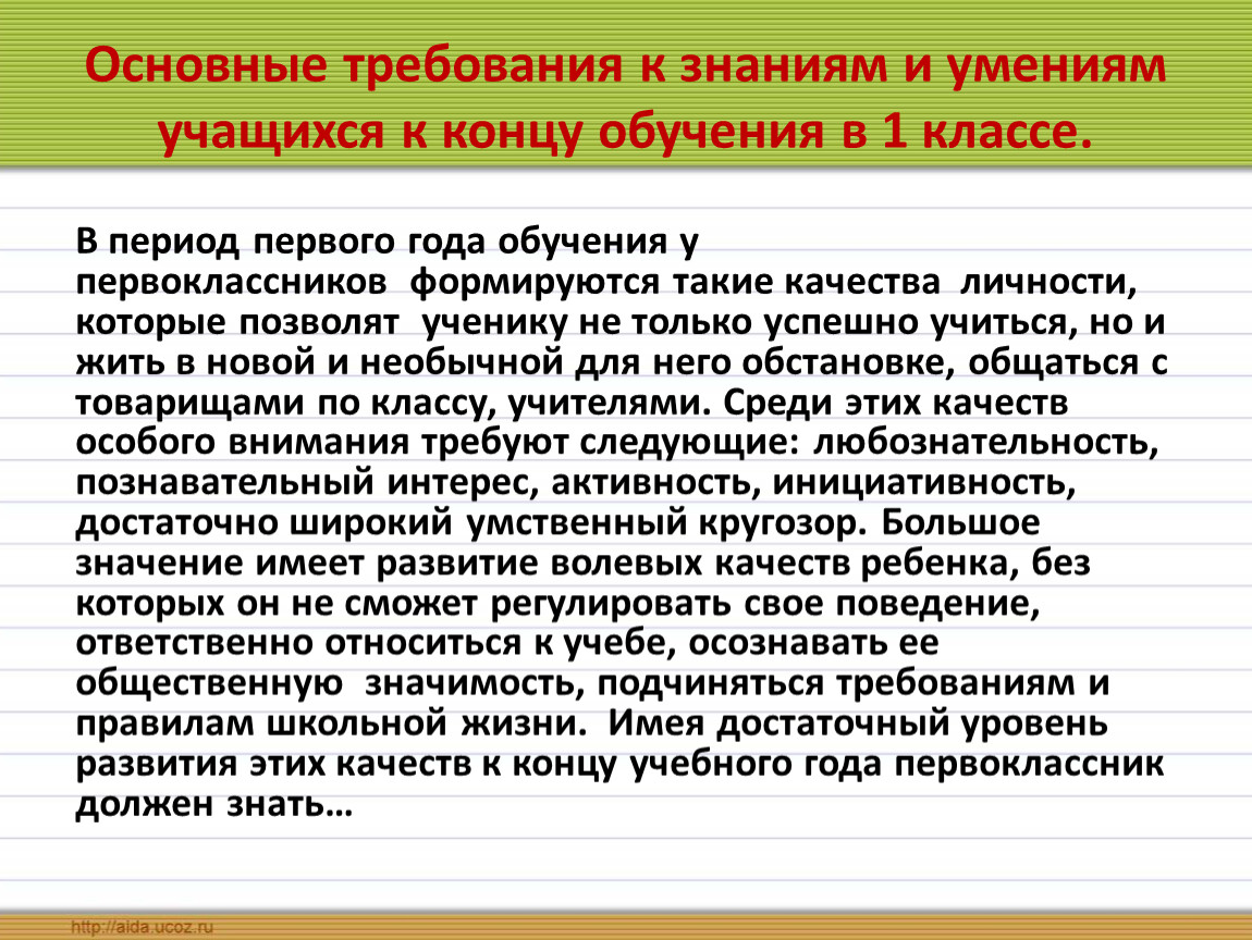 В период первого года обучения у первоклассников формируются такие качества личности, которые позволят ученику не только успешно учиться, но и жить в новой и необычной для него обстановке, общаться с товарищами по классу, учителями. Среди этих качеств особого внимания требуют следующие: любознательность, познавательный интерес, активность, инициативность, достаточно широкий умственный кругозор. Большое значение имеет развитие волевых качеств ребенка, без которых он не сможет регулировать свое поведение, ответственно относиться к учебе, осознавать ее общественную значимость, подчиняться требованиям и правилам школьной жизни. Имея достаточный уровень развития этих качеств к концу учебного года первоклассник должен знать…