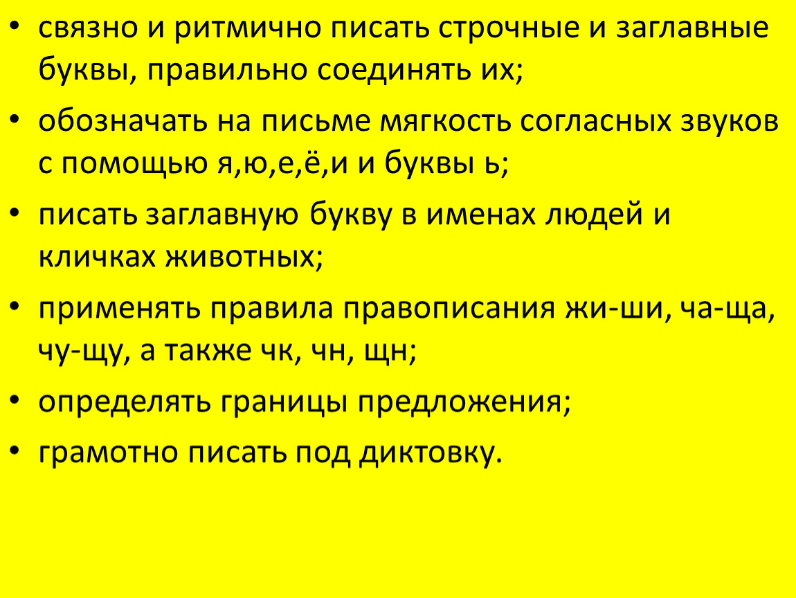 связно и ритмично писать строчные и заглавные буквы, правильно соединять их;