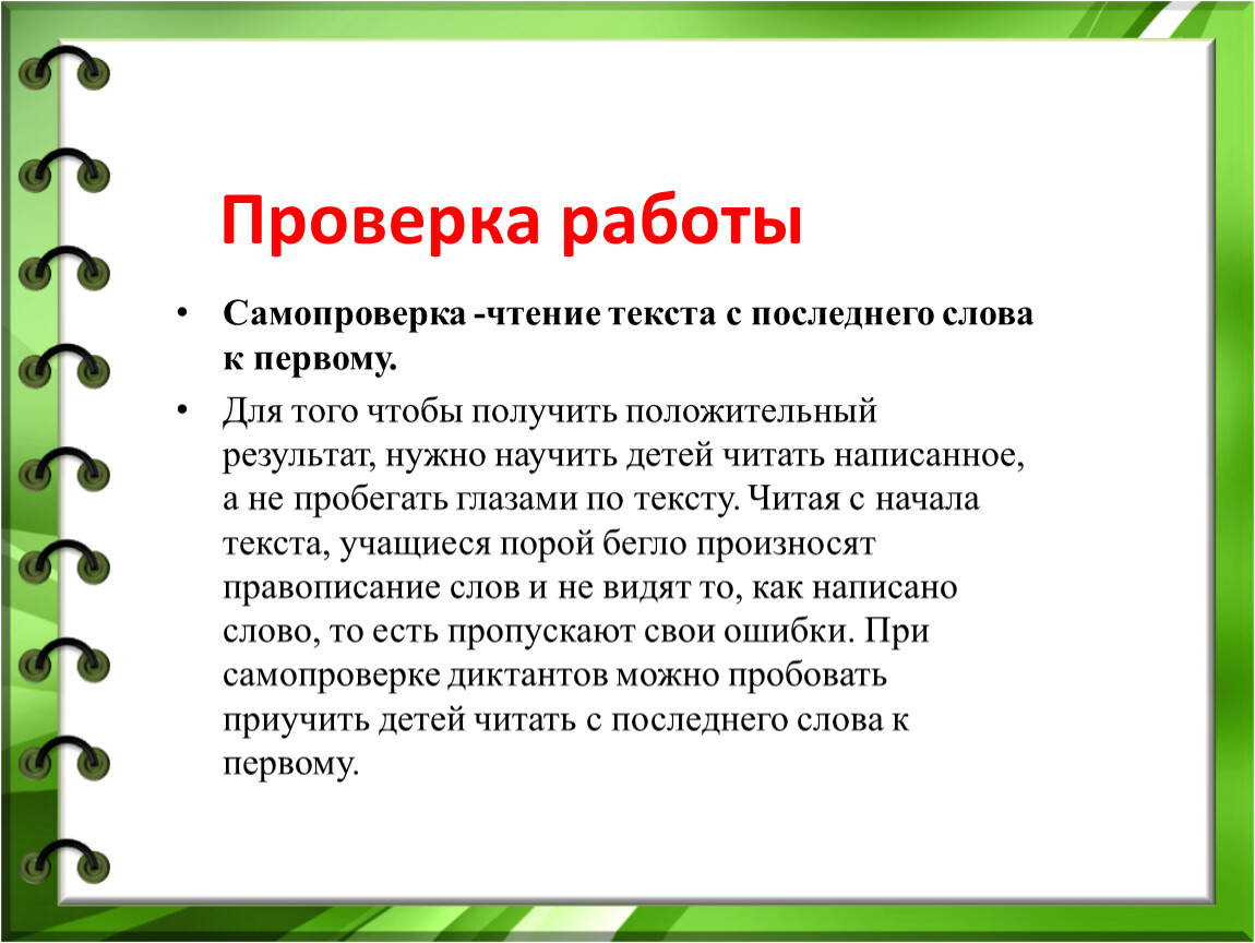 Для того чтобы получить положительный результат, нужно научить детей читать написанное, а не пробегать глазами по тексту. Читая с начала текста, учащиеся порой бегло произносят правописание слов и не видят то, как написано слово, то есть пропускают свои ошибки. При самопроверке диктантов можно пробовать приучить детей читать с последнего слова к первому.