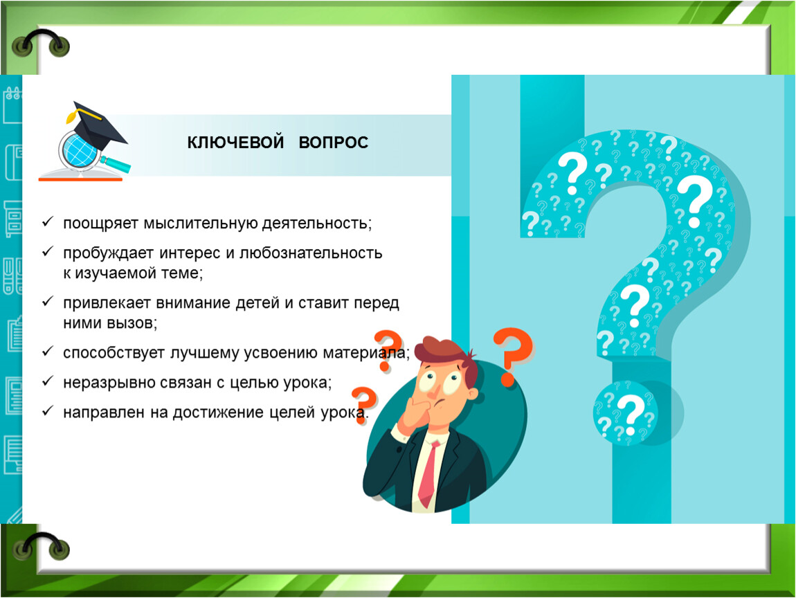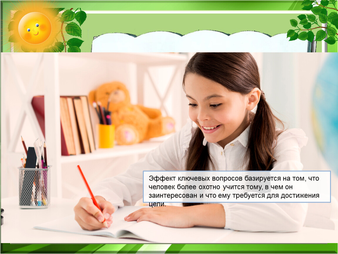 Эффект ключевых вопросов базируется на том, что человек более охотно учится тому, в чем он заинтересован и что ему требуется для достижения цели.