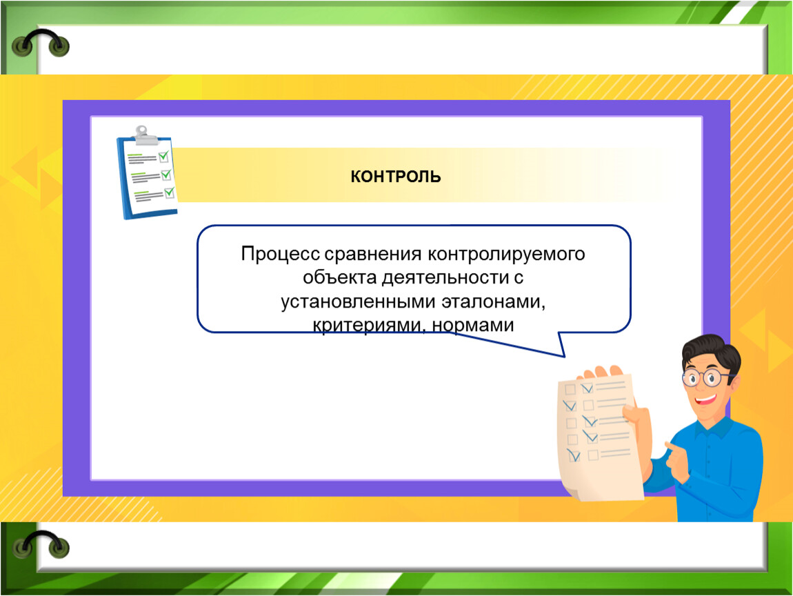 Процесс сравнения контролируемого объекта деятельности с установленными эталонами, критериями, нормами