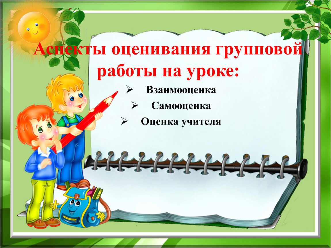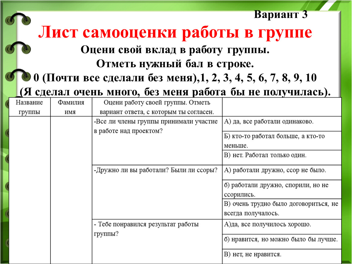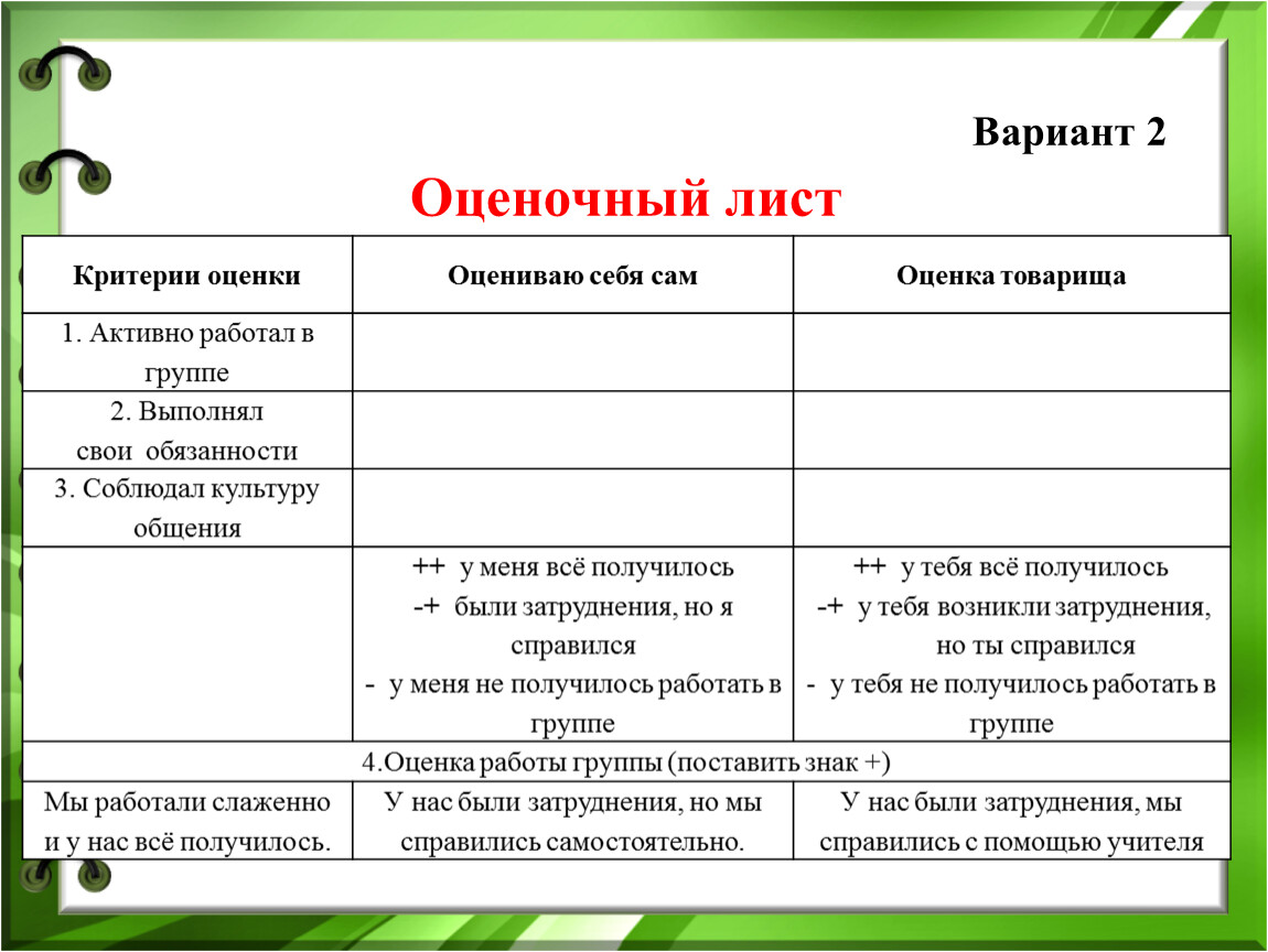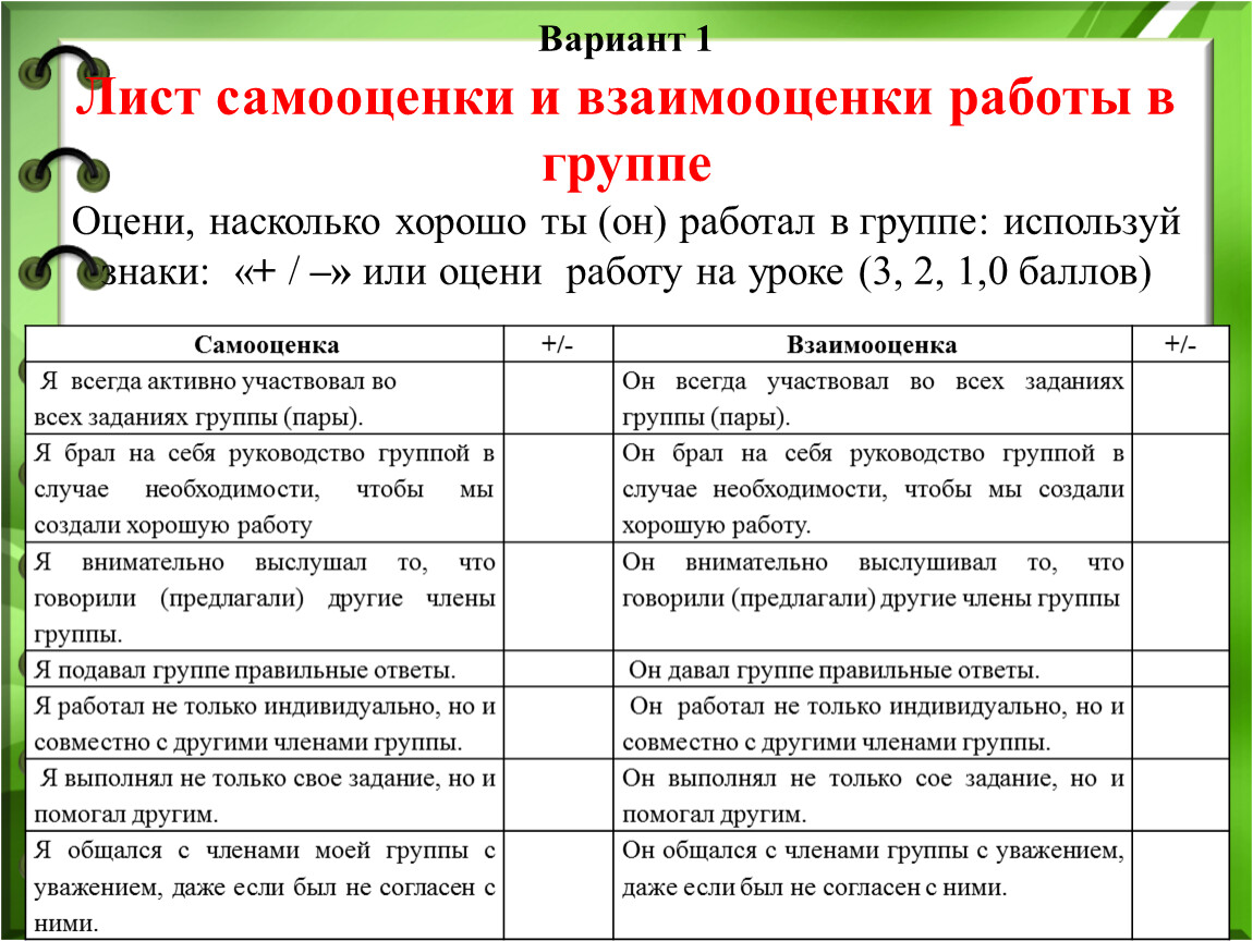 самооценка и взаимооценка;