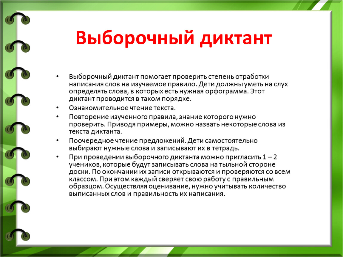 Выборочный диктант помогает проверить степень отработки написания слов на изучаемое правило. Дети должны уметь на слух определять слова, в которых есть нужная орфограмма. Этот диктант проводится в таком порядке.