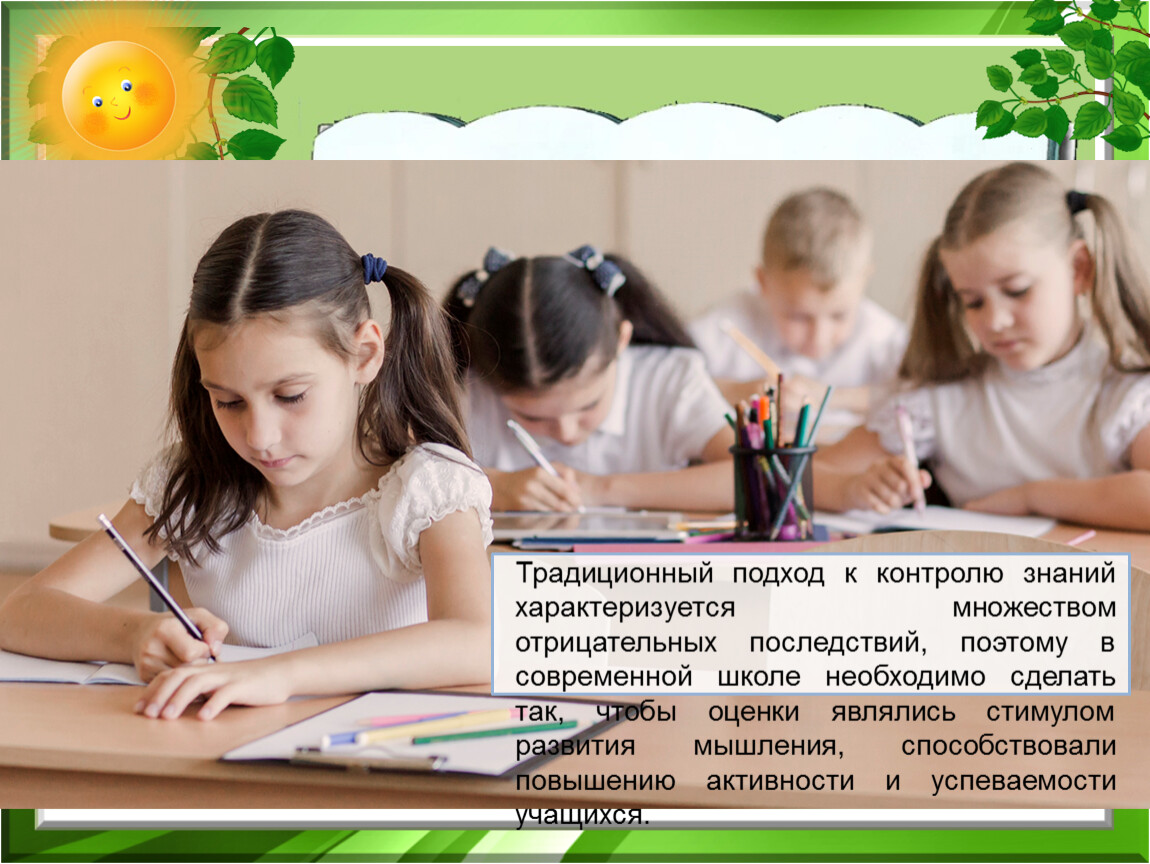 Традиционный подход к контролю знаний характеризуется множеством отрицательных последствий, поэтому в современной школе необходимо сделать так, чтобы оценки являлись стимулом развития мышления, способствовали повышению активности и успеваемости учащихся.