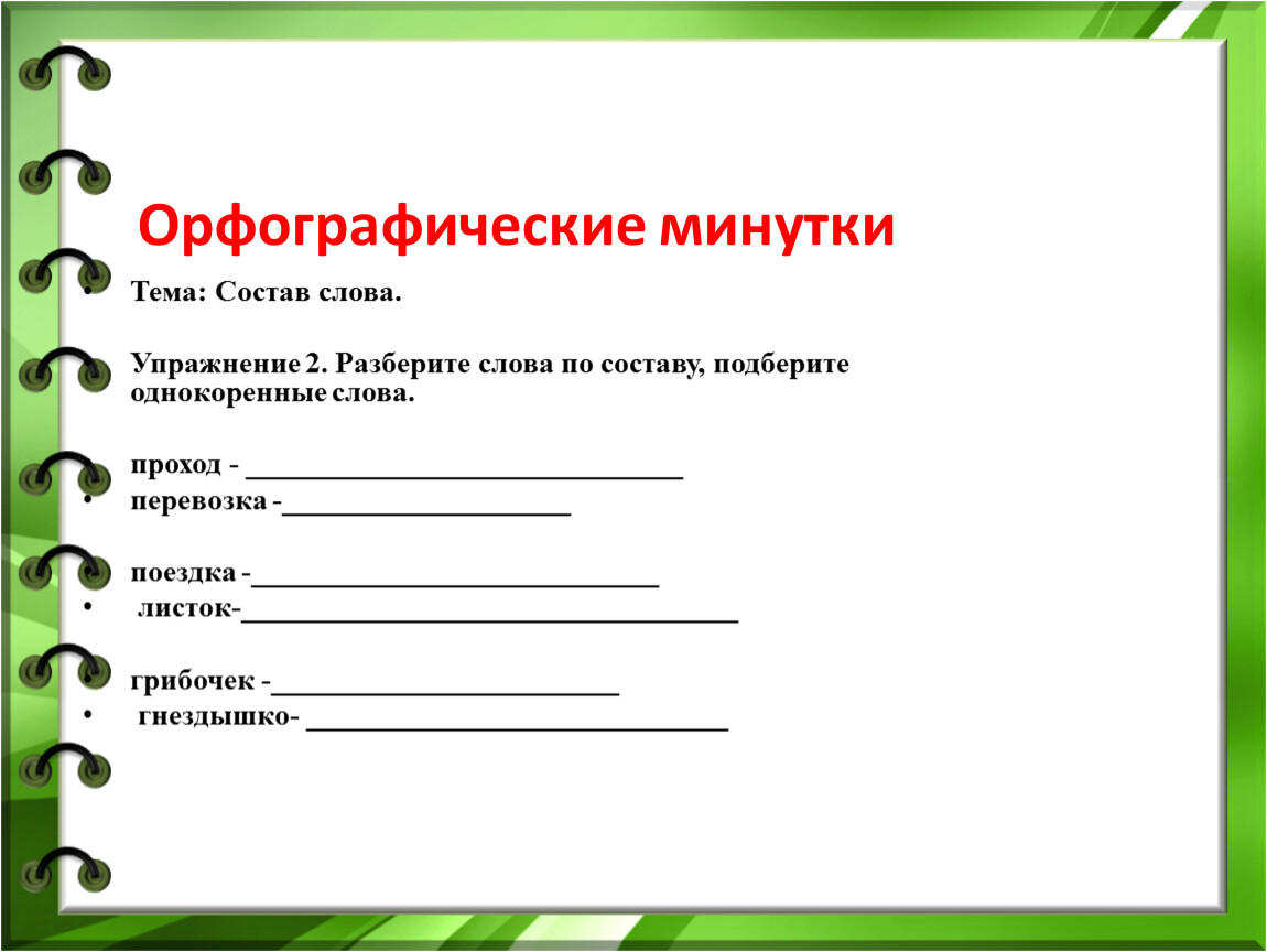 Упражнение 2. Разберите слова по составу, подберите однокоренные слова.