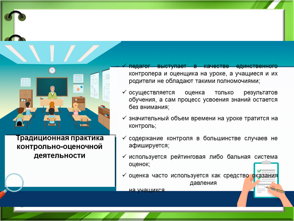 педагог выступает в качестве единственного контролера и оценщика на уроке, а учащиеся и их родители не обладают такими полномочиями;