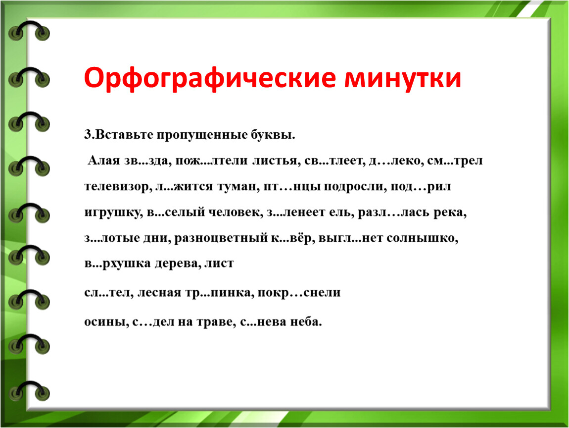 Алая зв...зда, пож...лтели листья, св...тлеет, д…леко, см...трел телевизор, л...жится туман, пт…нцы подросли, под…рил игрушку, в...селый человек, з...ленеет ель, разл…лась река, з...лотые дни, разноцветный к...вёр, выгл...нет солнышко, в...рхушка дерева, лист
