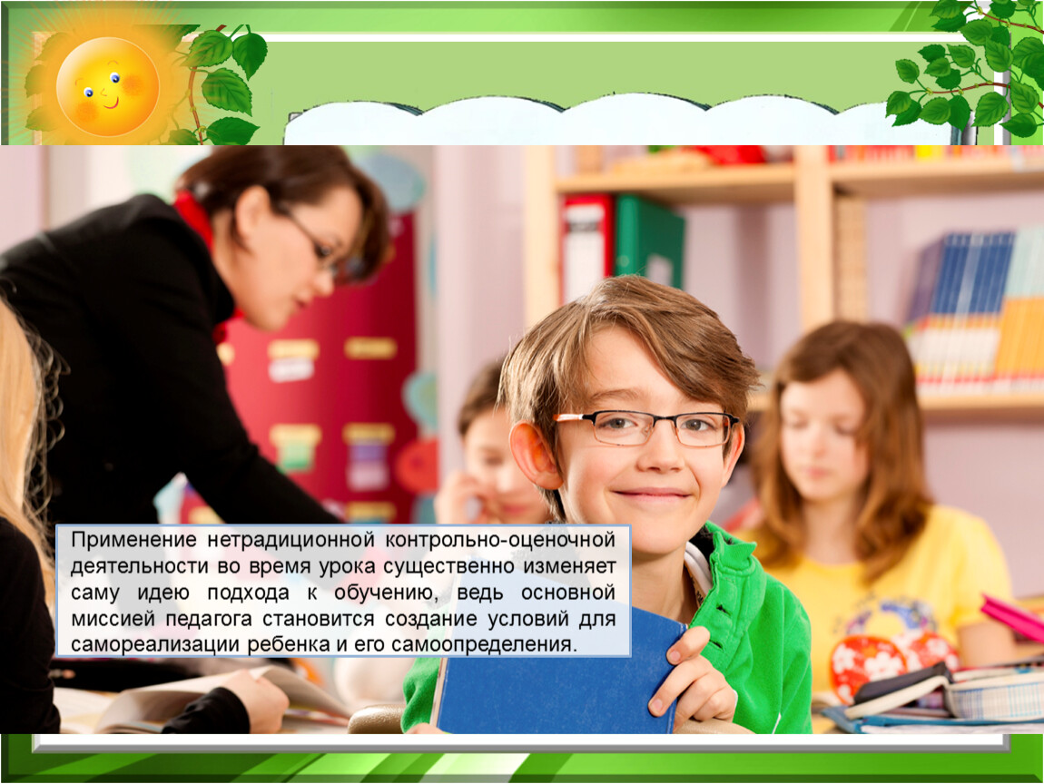 Применение нетрадиционной контрольно-оценочной деятельности во время урока существенно изменяет саму идею подхода к обучению, ведь основной миссией педагога становится создание условий для самореализации ребенка и его самоопределения.