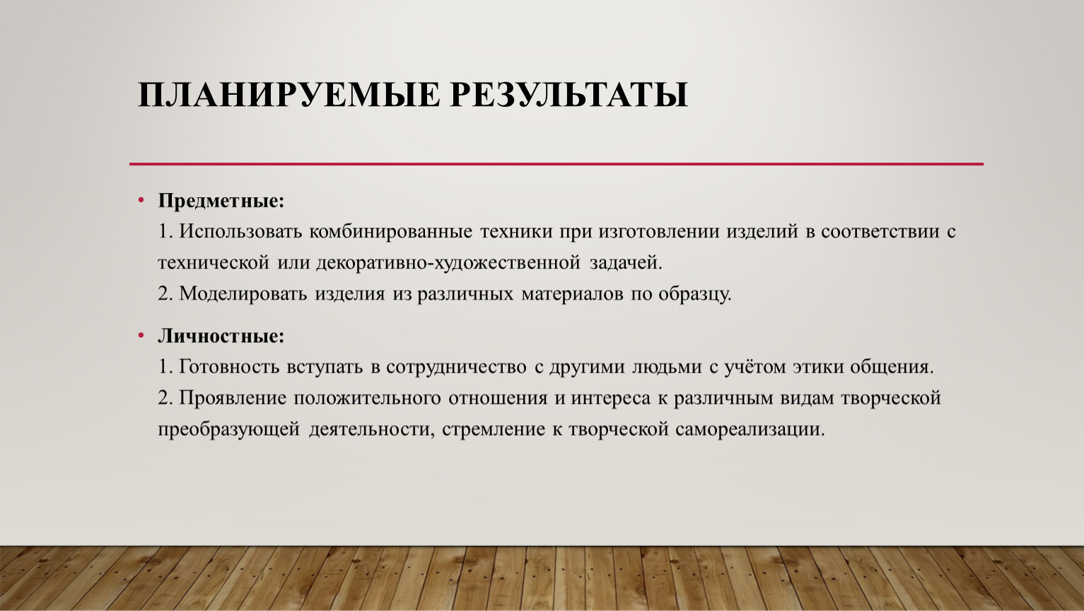 Предметные:1. Использовать комбинированные техники при изготовлении изделий в соответствии с технической или декоративно-художественной задачей.2. Моделировать изделия из различных материалов по образцу.