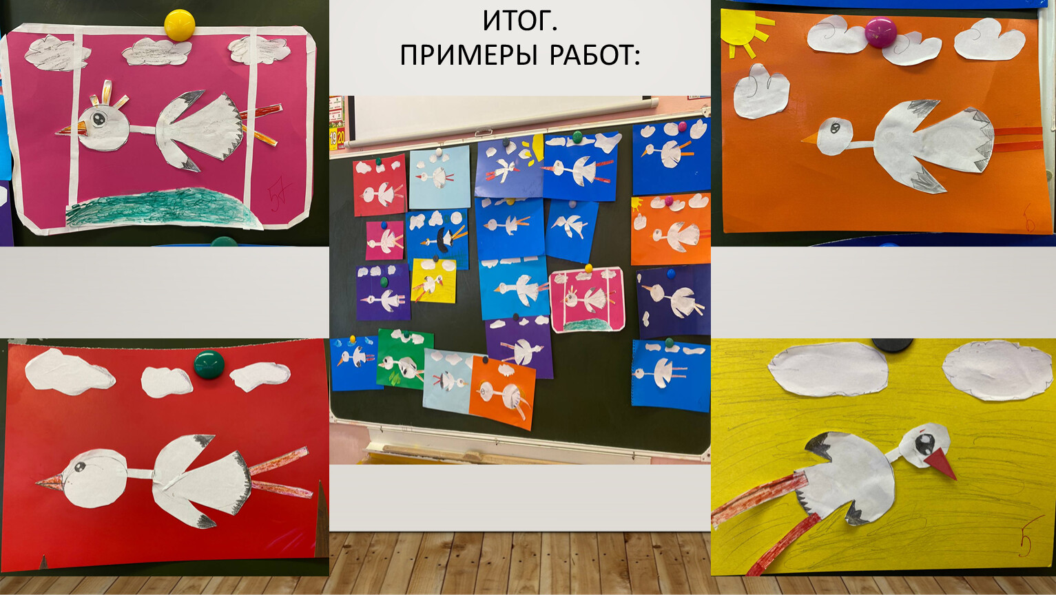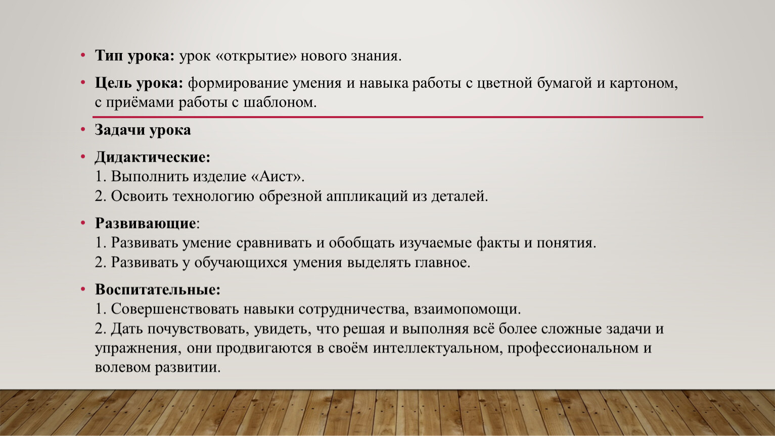 Дидактические:1. Выполнить изделие «Аист».2. Освоить технологию обрезной аппликаций из деталей.
