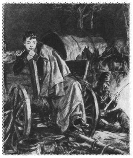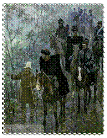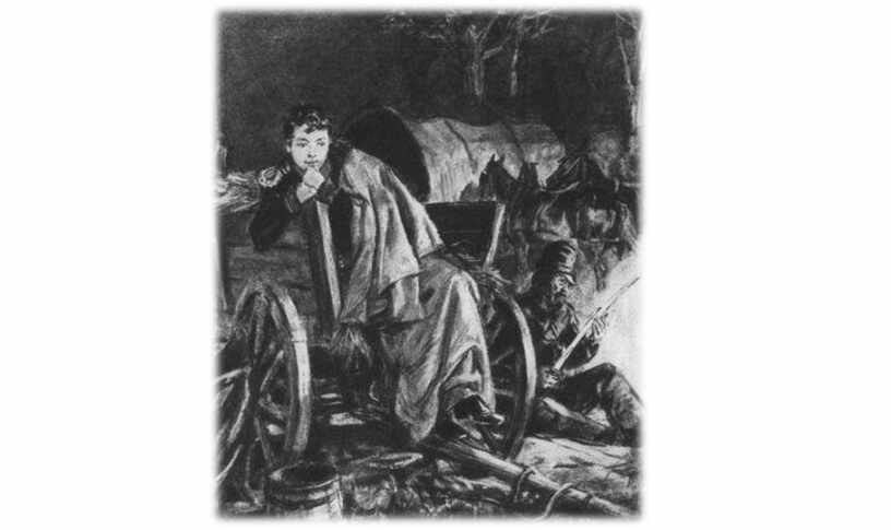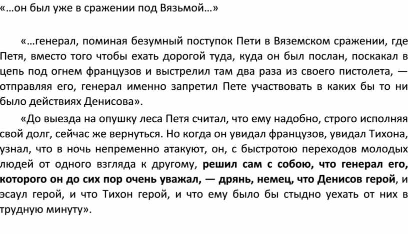 «…генерал, поминая безумный поступок Пети в Вяземском сражении, где Петя, вместо того чтобы ехать дорогой туда, куда он был послан, поскакал в цепь под огнем французов и выстрелил там два раза из своего пистолета, — отправляя его, генерал именно запретил Пете участвовать в каких бы то ни было действиях Денисова».