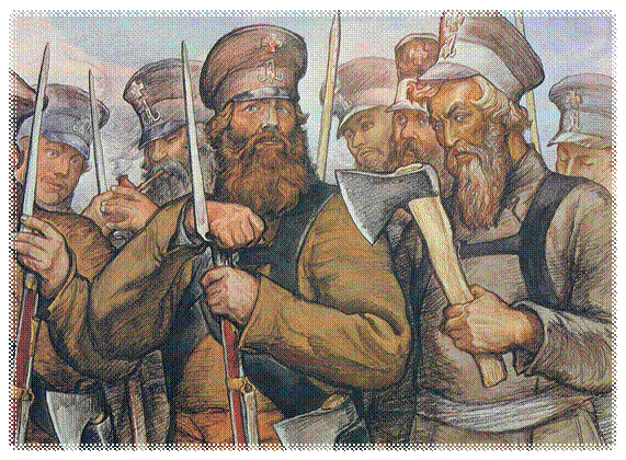 «Оружие его составляли мушкетон, который он носил больше для смеха, пика и топор, которым он владел, как волк владеет зубами, одинаково легко выбирая ими блох из шерсти и перекусывая толстые кости. Тихон одинаково верно, со всего размаха, раскалывал топором бревна и, взяв топор за обух, выстрагивал им тонкие колышки и вырезывал ложки».