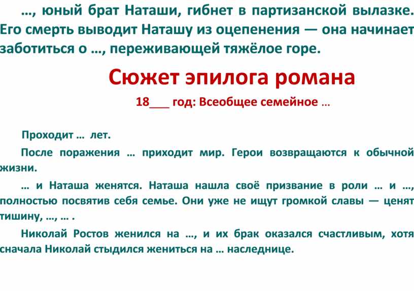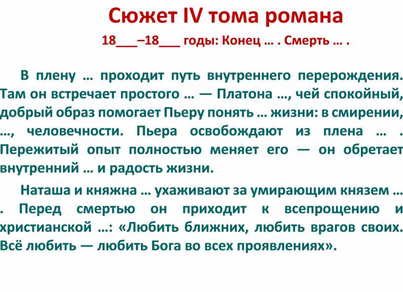 Наташа и княжна … ухаживают за умирающим князем … . Перед смертью он приходит к всепрощению и христианской …: «Любить ближних, любить врагов своих. Всё любить — любить Бога во всех проявлениях».