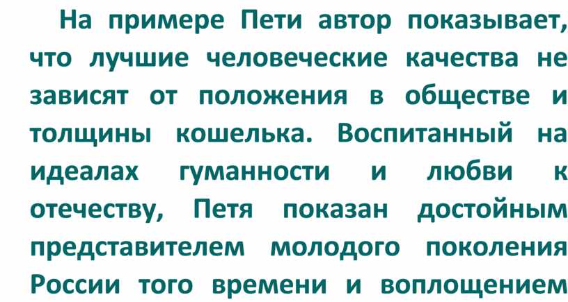 На примере Пети автор показывает, что лучшие человеческие качества не зависят от положения в обществе и толщины кошелька. Воспитанный на идеалах гуманности и любви к отечеству, Петя показан достойным представителем молодого поколения России того времени и воплощением души семьи Ростовых — доброй и искренной.
