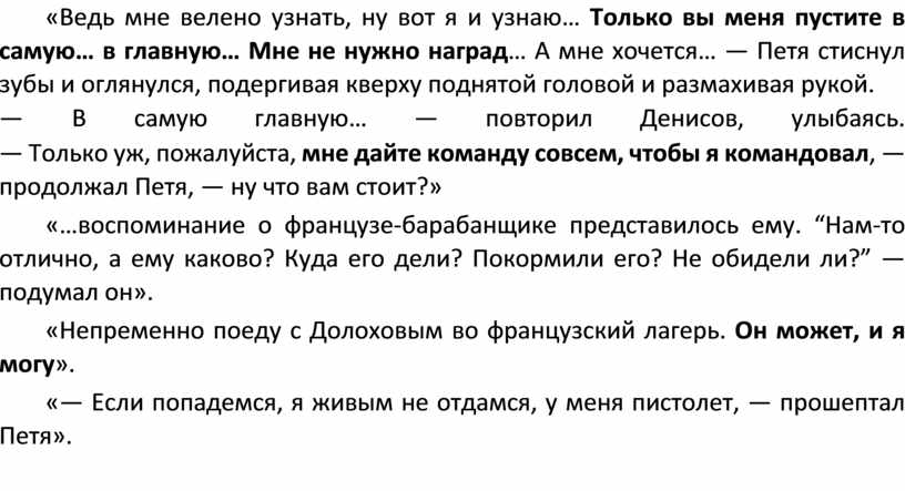 «Во всю дорогу Петя приготавливался к тому, как он, как следует большому и офицеру, не намекая на прежнее знакомство, будет держать себя с Денисовым. Но как только Денисов улыбнулся ему, Петя тотчас же просиял, покраснел от радости и, забыв приготовленную официальность, начал рассказывать о том, как он проехал мимо французов, и как он рад, что ему дано такое поручение, и что он был уже в сражении под Вязьмой, и что там отличился один гусар».