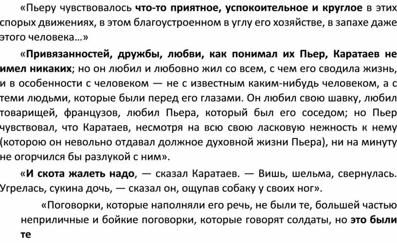 «Привязанностей, дружбы, любви, как понимал их Пьер, Каратаев не имел никаких; но он любил и любовно жил со всем, с чем его сводила жизнь, и в особенности с человеком — не с известным каким-нибудь человеком, а с теми людьми, которые были перед его глазами. Он любил свою шавку, любил товарищей, французов, любил Пьера, который был его соседом; но Пьер чувствовал, что Каратаев, несмотря на всю свою ласковую нежность к нему (которою он невольно отдавал должное духовной жизни Пьера), ни на минуту не огорчился бы разлукой с ним».