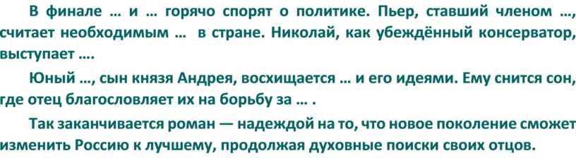 В финале … и … горячо спорят о политике. Пьер, ставший членом …, считает необходимым … в стране. Николай, как убеждённый консерватор, выступает ….